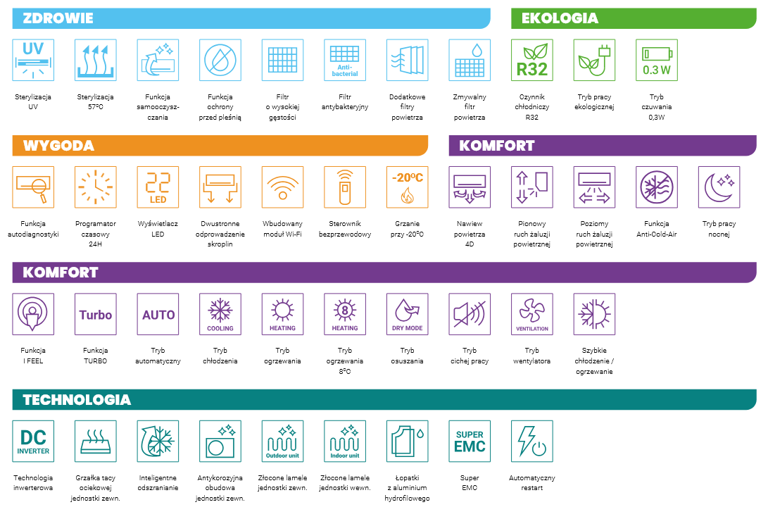 Zaawansowana filtracja - Kilkustopniowy system filtracji zapewnia czyste i bezpieczne powietrze w klimatyzowanym pomieszczeniu.