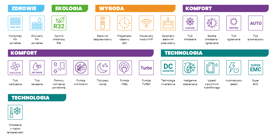 Funkcja chłodzenia oraz ogrzewania - Urządzenie całoroczne 2 w 1. Ogrzewanie zimą i chłodzenie latem.